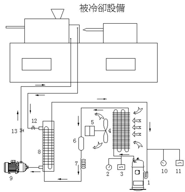 3、先將冷凍水箱加滿水或其它冷凍介質後方可啟動水泵;(注:請根據要求來配用冷凍介質)